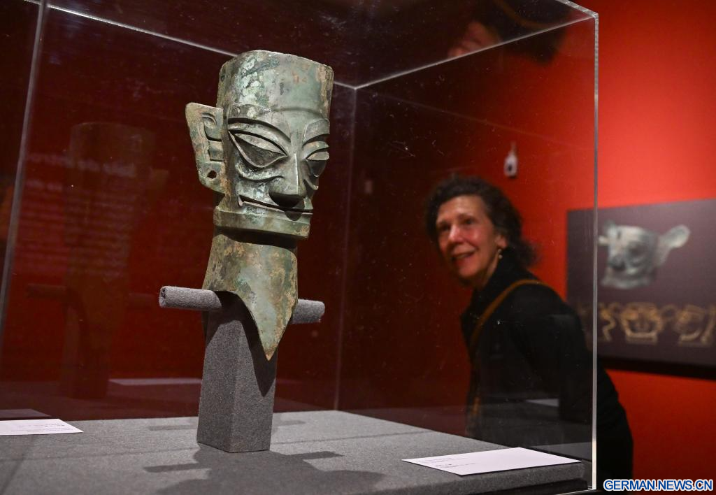 GUADALAJARA, 18. März 2026 (Xinhuanet) -- Besucher betrachten einen Bronzekopf aus der archäologischen Stätte Sanxingdui während einer Ausstellung über die südwestchinesische Bronzekultur im Guadalajara Museum in Guadalajara, Spanien, 17. März 2026. Am Dienstagabend wurde im Guadalajara Museum in Spanien eine Ausstellung über die südwestchinesische Bronzekultur eröffnet, die die vielfältigen antiken Kulturen und das einzigartige gesellschaftliche Leben des Gebiets präsentiert.