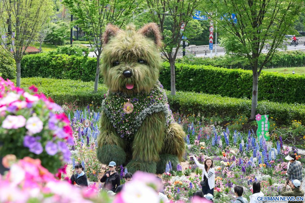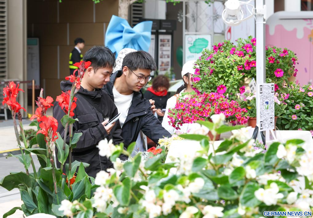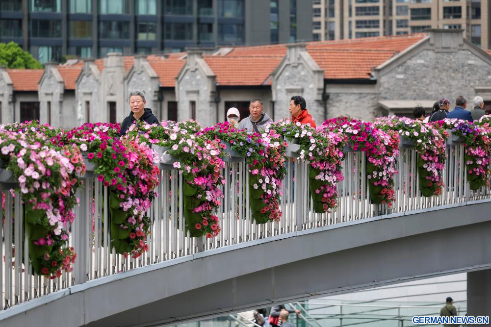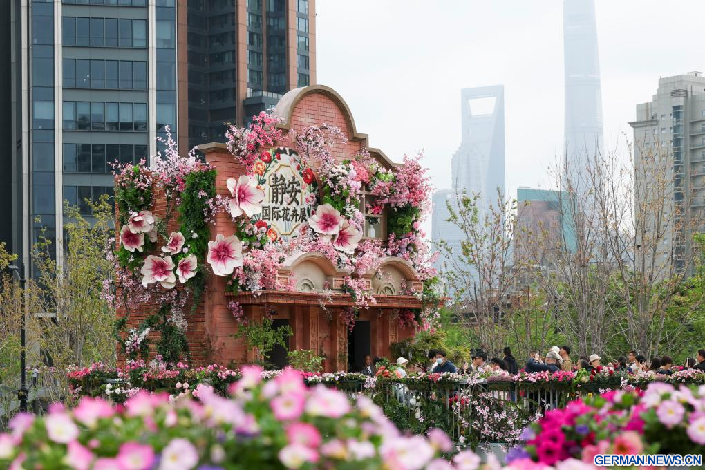 Menschen besuchen eine Blumenmesse im Bezirk Jing'an in Shanghai in Ostchina, 18. April 2026. Die Internationale Blumenmesse Shanghai 2026 wurde am Samstag mit Veranstaltungen an zwei Hauptveranstaltungsorten, zehn Nebenveranstaltungsorten und zahlreichen weiteren Ausstellungsorten in der ganzen Stadt eröffnet.