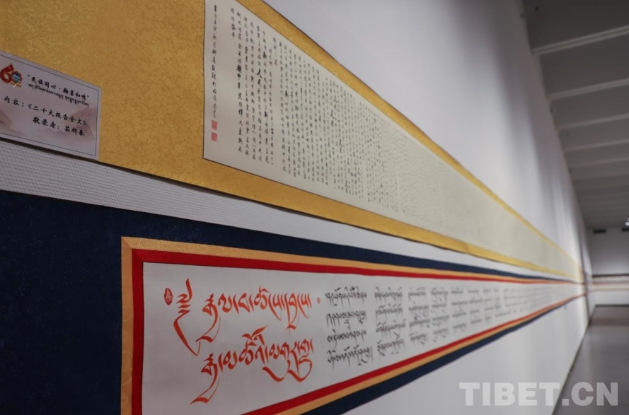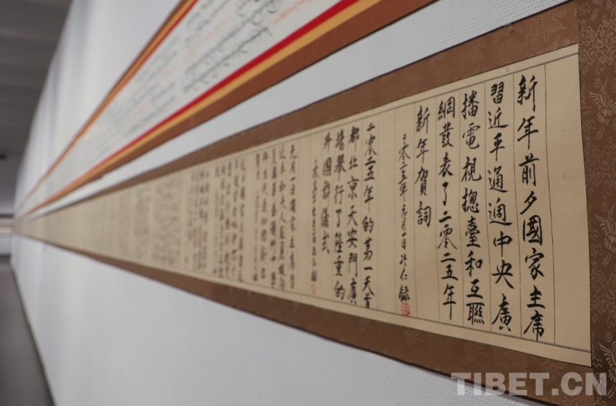 Derzeit wird die Kunstausstellung der Schriftrollenwerke „Volksgruppen-Eintracht – Kalligraphischer Einklang“ im Tibetischen Kunstmuseum gezeigt. Diese Kunstausstellung präsentiert konzentriert die Schriftrollenwerke von zehn Kalligraphen der Kalligraphievereinigung der Stadt Nyingchi. Wie zu erfahren war, starteten die zehn Kalligraphen seit Oktober 2018 mit Pinsel und Tusche als Medium eine mehrmonatige künstlerische Schaffensreise, auf der sie wichtige Inhalte wie die „Sagya-Sprichwörter“ auf über hundert Meter lange Schriftrollen niederschrieben. Insgesamt schufen und stellten sie vierzehn kalligrafische Langrollenwerke aus, die konzentriert die Liebe zum Vaterland, das Festhalten an der Volksgruppen-Kultur und die Geschichte der Volksgruppen-Einmütigkeit und Geschlossenheit zeigen.
