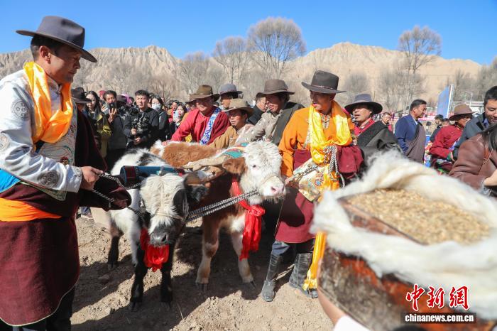 Kürzlich kamen in Guide der Provinz Qinghai Menschen in festlicher Kleidung mit Frühlingsbestellungs-Brot (auf Tibetisch „Tonggao“ genannt) auf die Felder, um mit der traditionellen Methode „Zwei Ochsen und eine Schulterstange“ die „erste Furche“ der Frühlingsbestellung zu ziehen und so die Hoffnung auf Frieden im Land, Wohlstand für das Volk, günstiges Wetter und reiche Ernten auszudrücken. Das Bild zeigt Menschen, die die „erste Furche“ der Frühlingsbestellung ziehen.