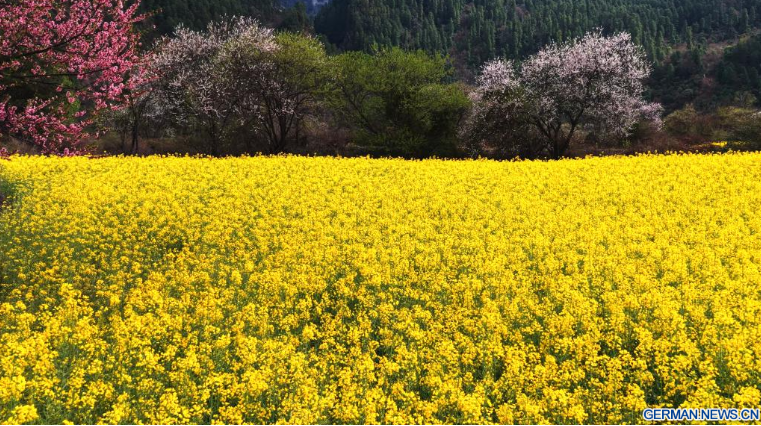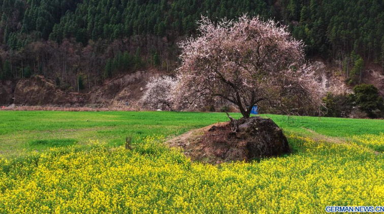 Die Luftaufnahme einer Drohne vom 20. März 2026 zeigt die Pfirsichblüten und ein Feld voller Rapsblüten im Kreis Bomi der Stadt Nyingchi im südwestchinesischen Autonomen Gebiet Xizang. Die Raps- und Pfirsichblüten stehen hier in voller Blüte und schaffen eine malerische Szenerie auf dem Plateau.