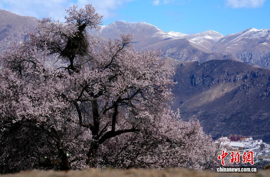Die blühenden Pfirsichbäume im Dorf Tshechogling in Lhasa in Xizang bilden einen harmonischen Kontrast zum Potala-Palast. Die alten Pfirsichbäume im Dorf Tshechogling am Südufer des Lhasa-Flusses in Xizang stehen in voller Blüte und schaffen zusammen mit dem Potala-Palast ein malerisches Frühlingsbild.