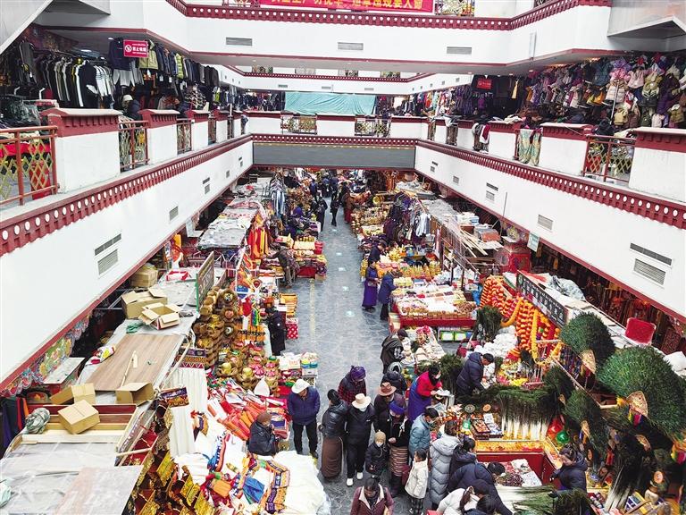 Eine vielfältige Auswahl an Neujahrsvorräten erstreckt sich vom Erdgeschoss bis zum zweiten Stock, mit geordneten Bereichen für Neujahrssegenssprüche, Schafsköpfe, Yakbutter-Skulpturen, Hochlandgerstengras, Süßigkeiten und Nüsse, die einen Rundum-Einkauf ermöglichen. Derzeit herrscht im Kaufhaus reger Betrieb mit einem durchschnittlichen täglichen Besucherstrom von 5000 Personen.