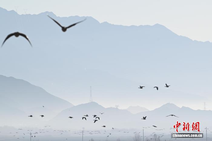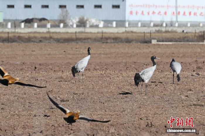 Im Naturschutzgebiet für Schwarzhalskraniche des Kreises Lhünzhub in Lhasa in Xizang überwintern und leben zahlreiche Zugvogelschwärme. Die Feuchtgebiete, Ackerflächen und Stauseen dort bilden einen idealen Lebensraum, wo sich über zehntausend Zugvögel wie Schwarzhalskraniche, Streifengänse und Rostgänse versammeln. Sie kreisen in der Luft oder suchen auf den Feldern nach Nahrung – ein prächtiges ökologisches Bild des Hochlands.