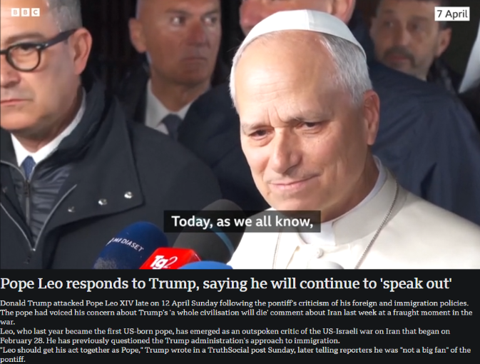 Am 13. April reagierte Papst Leo XIV. auf Trumps Kritik und erklärte, er werde weiterhin „seine Stimme erheben“. (Foto von der British Broadcasting Corporation)
