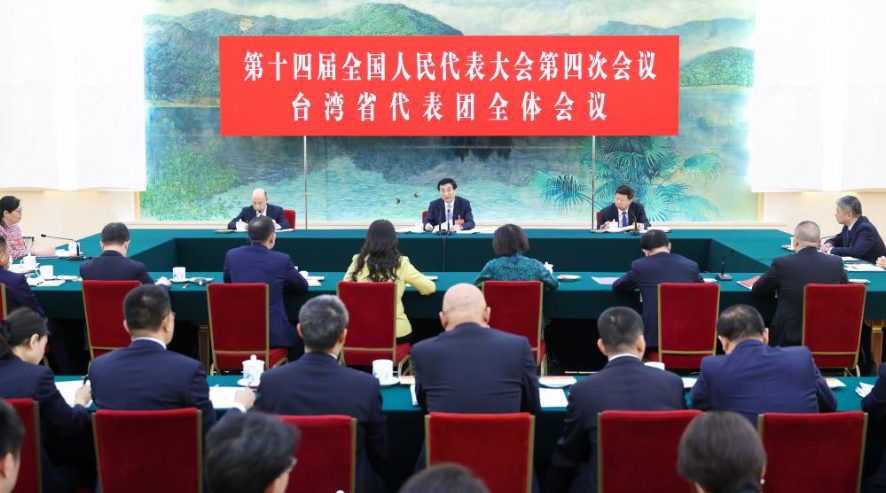 Wang Huning, Mitglied des Ständigen Ausschusses des Politbüros des Zentralkomitees der Kommunistischen Partei Chinas (KPCh) und Vorsitzender des Landeskomitees der Politischen Konsultativkonferenz des Chinesischen Volkes (PKKCV), nimmt an einer Gruppenberatung mit Abgeordneten des Nationalen Volkskongresses (NVK) aus der Taiwan-Delegation während der vierten Tagung des 14. Nationalen Volkskongresses in Chinas Hauptstadt Beijing teil, 7. März 2026.