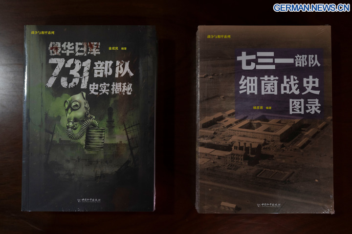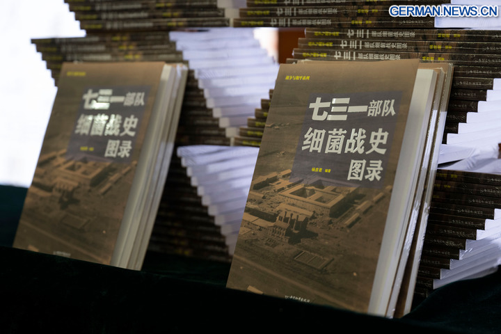HARBIN, 18. September 2025 (Xinhua) -- Das Foto zeigt Bücher über die Verbrechen der Einheit 731 während einer Buchvorstellung in der Ausstellungshalle für Beweise der Verbrechen der Einheit 731 der Kaiserlich Japanischen Armee in Harbin in der Provinz Heilongjiang im Nordosten Chinas, 17. September 2025. Die beiden Bücher, die die neuesten Forschungsergebnisse aus länderübergreifender Verifizierung, mündlichen Überlieferungen und mehrsprachigen Archiven enthalten, dokumentieren die Verbrechen der Einheit 731 und enthüllen Japans Kriegsgräuel.