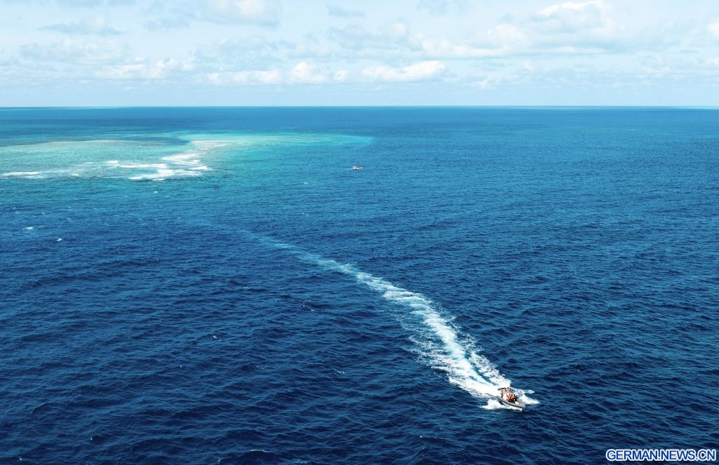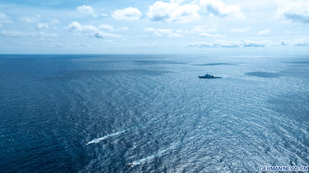 SÜDCHINESISCHES MEER, 24. November 2025 (Xinhuanet) -- Die Luftaufnahme einer Drohne zeigt die chinesische Küstenwache (CCG) bei der Patrouille in den Hoheitsgewässern von Chinas Huangyan Dao und den umliegenden Gebieten, 14. November 2025.