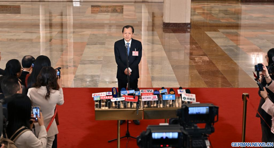 Der chinesische Verkehrsminister Liu Wei gibt nach der zweiten Plenarsitzung der vierten Tagung des 14. Nationalen Volkskongresses (NVK) in der Großen Halle des Volkes in der chinesischen Hauptstadt Beijing ein Interview, 9. März 2026.