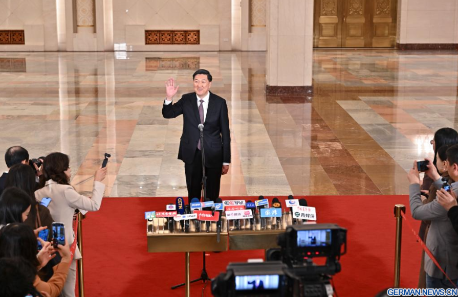 Der chinesische Minister für Landwirtschaft und ländliche Angelegenheiten Han Jun gibt nach der zweiten Plenarsitzung der vierten Tagung des 14. Nationalen Volkskongresses (NVK) in der Großen Halle des Volkes in der chinesischen Hauptstadt Beijing ein Interview, 9. März 2026.