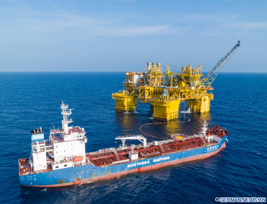 Das undatierte Archivfoto zeigt einen Shuttle-Öltanker beim Andocken an die Energieplattform „Deep Sea No. 1“ zwecks Öltransport. (CNOOC/Handout via Xinhua)