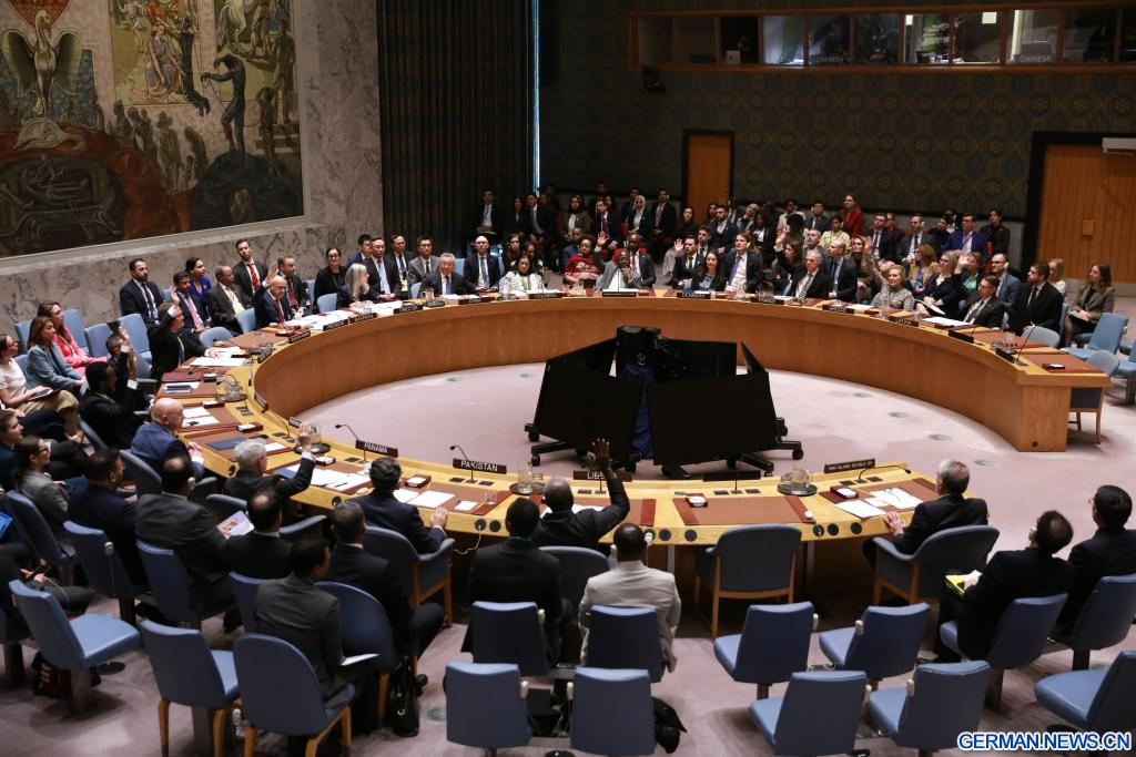 VEREINTE NATIONEN, 7. April 2026 (Xinhuanet) -- Chinas Ständiger Vertreter bei den Vereinten Nationen, Fu Cong (M., vorne), legt sein Veto gegen einen Resolutionsentwurf des UN-Sicherheitsrats zur Straße von Hormus im UN-Hauptquartier in New York ein, 7. April 2026. Der UN-Sicherheitsrat scheiterte am Dienstag bei der Verabschiedung eines Resolutionsentwurfs, der Staaten, die an der Nutzung kommerzieller Seewege in der Straße von Hormus interessiert sind, „nachdrücklich dazu ermutigt“, Maßnahmen mit defensivem Charakter zu koordinieren, um zur Gewährleistung der Sicherheit und des Schutzes der Schifffahrt durch die Straße von Hormus beizutragen, unter anderem durch die Begleitung von Handels- und Frachtschiffen.