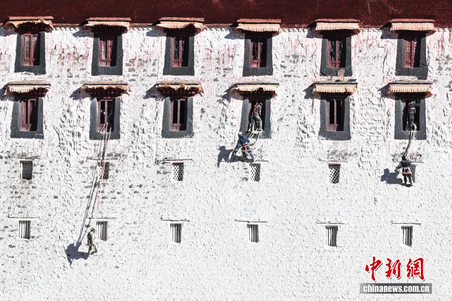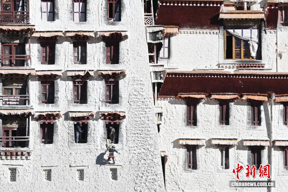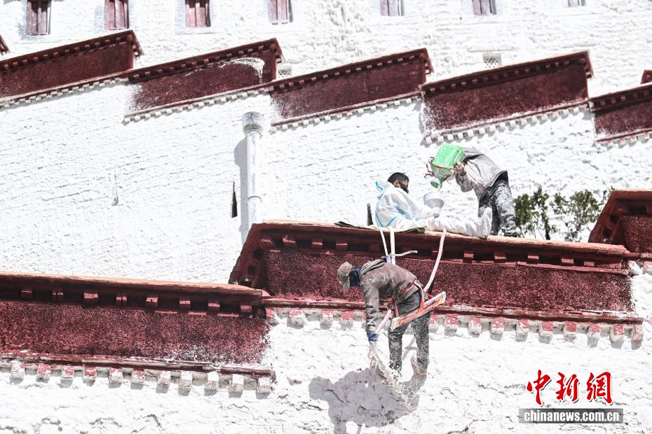 Kürzlich verwandelten sich Fachkräfte des Verwaltungskomitees des Potala-Palasts in Xizang in „Spinnenmenschen“, schwebten in der Luft und spritzten Farbe, was zu einer einzigartigen Szenerie auf den Palastmauern wurde. Diese seit über 300 Jahren bestehende Tradition ist eine entscheidende Maßnahme zum Schutz der Mauern nach der Regenzeit.