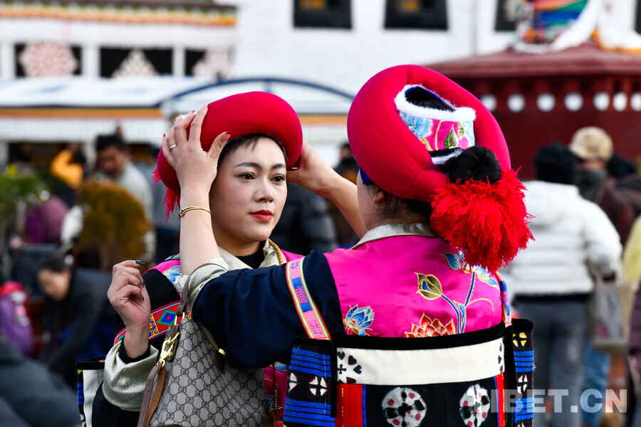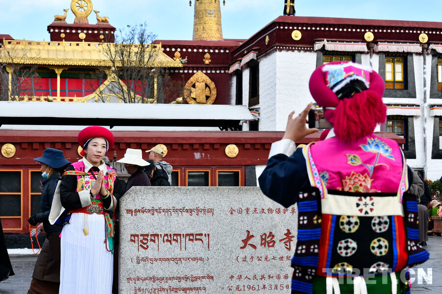 Seit der Einführung der 8. Runde der Förderpolitik „Xizang-Reise im Winter“ steigt die Beliebtheit dieser Reisezeit stetig, und immer mehr Touristen strömen herbei. Zum Jahreswechsel werden Besucher aus dem Autonomen Bezirk Dêqên der Tibeter in Yunnan, die traditionelle Kleidung tragen, zu einer malerischen Attraktion auf der uralten Barkhor-Straße.