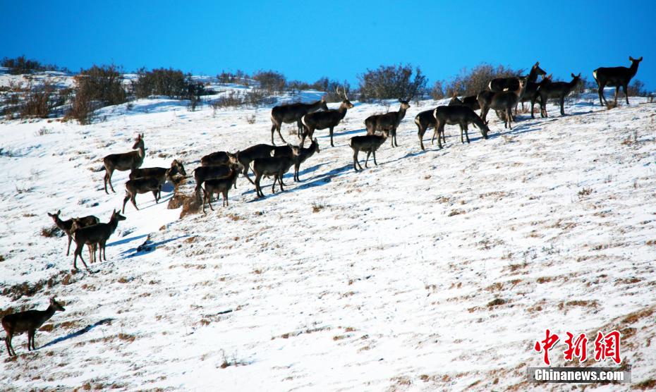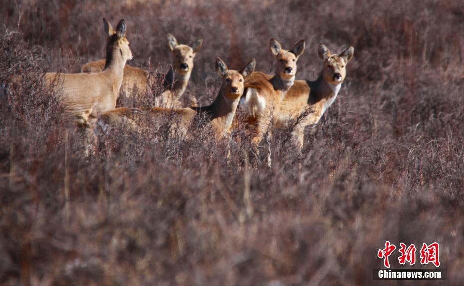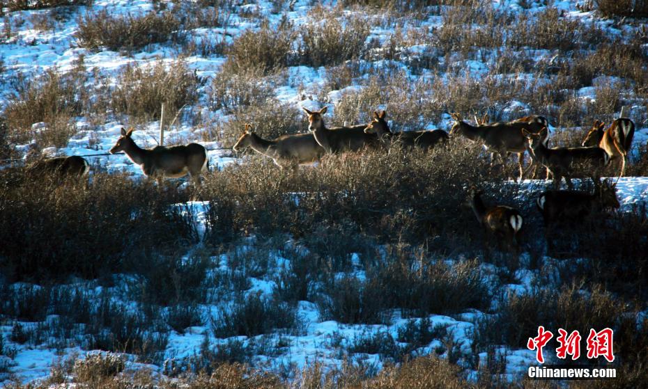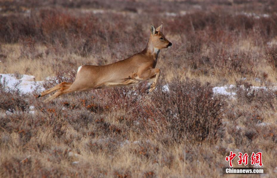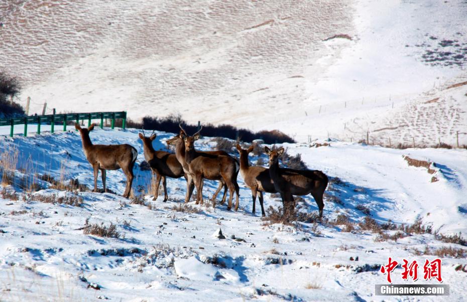 Im Frühling erwacht die Zhuaxixiulong-Prärie am Fuß des Maya-Schneegebirges im Autonomen Kreis Tianzhu der Tibeter in der bezirksfreien Stadt Wuwei der Provinz Gansu zum Leben. Die Rothirsche und Rehe, die unter nationalem Schutz der zweiten Klasse stehen, springen und galoppieren in Herden umher. Ihr munteres Treiben vor dem schneebedeckten Grasland bildet ein harmonisches Bild und schafft ein malerisches ökologisches Panorama.