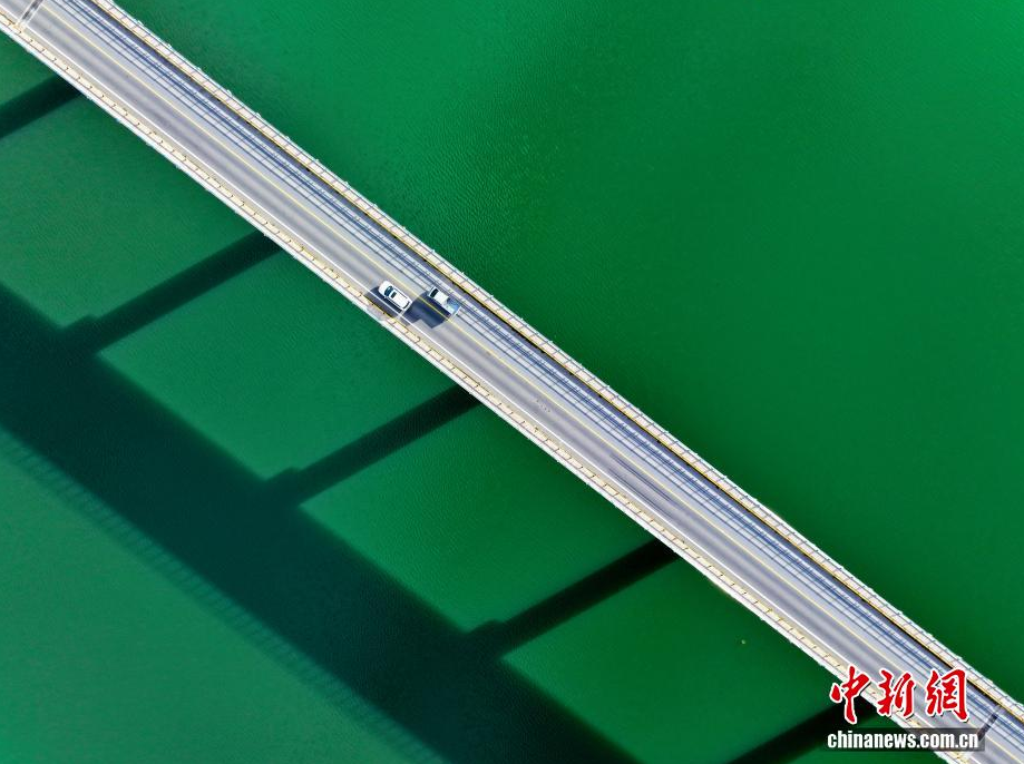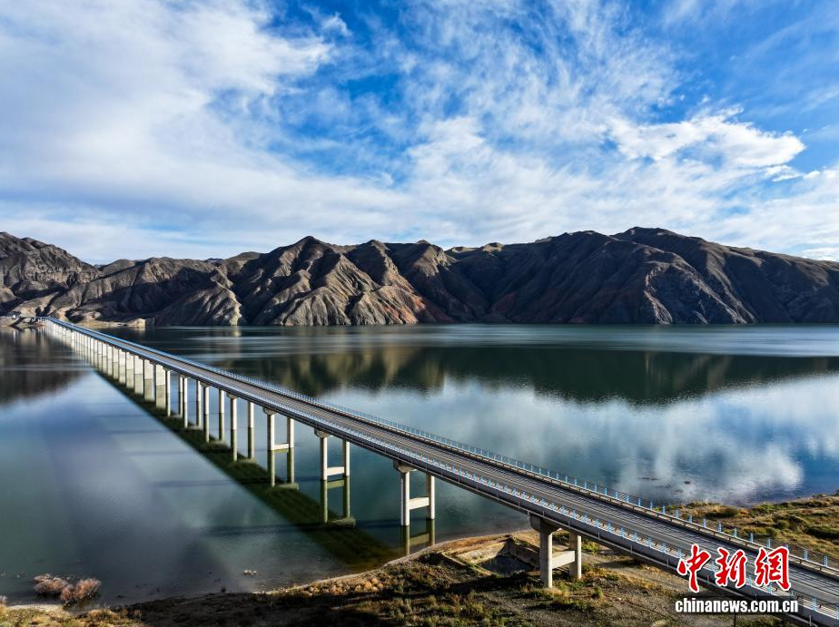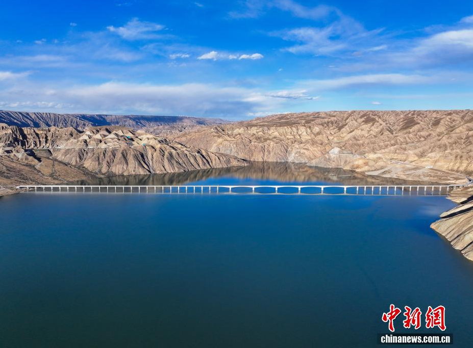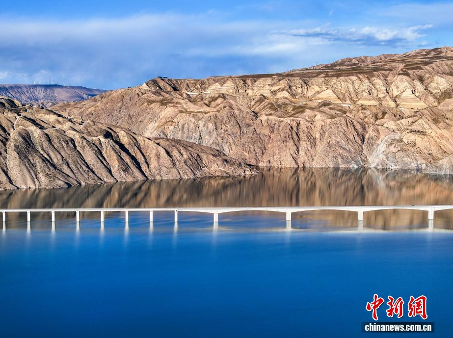Luftaufnahme der Gagama-Yangqu-Brücke des Gelben Flusses im Autonomen Bezirk Hainan der Tibeter in der Provinz Qinghai. Die Brücke erstreckt sich über eine Gesamtlänge von 2418 Metern, wobei der höchste Hauptpfeiler 115 Meter erreicht, und bildet eine wichtige Verkehrsader, die die Kreise Tongde, Xinghai und Guinan im Autonomen Bezirk Hainan verbindet. Abbildung zeigt die Gagama-Yangqu-Brücke des Gelben Flusses.