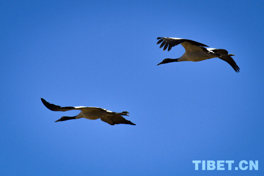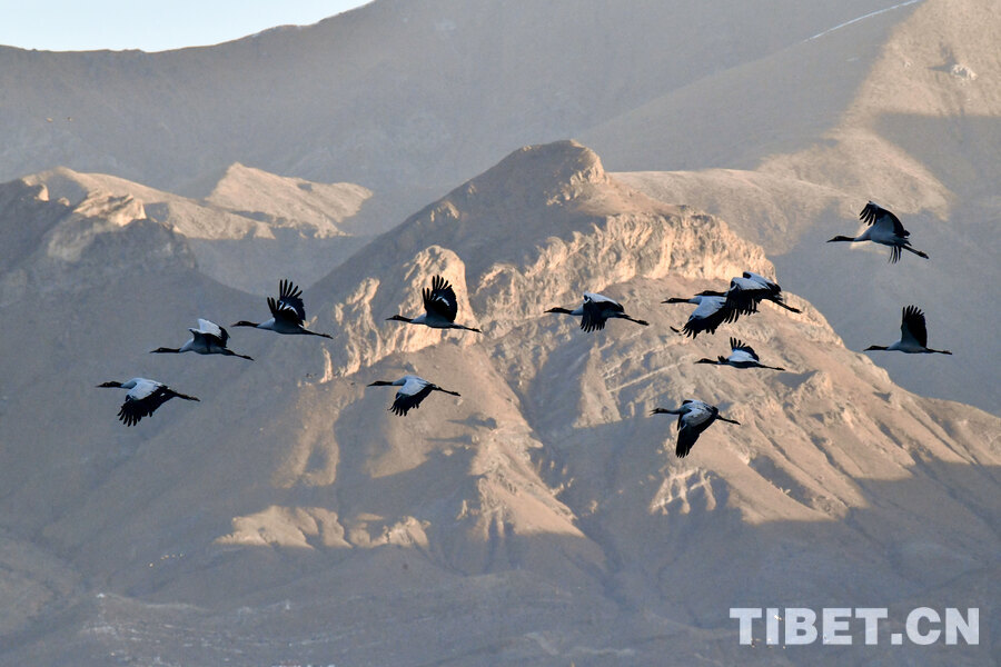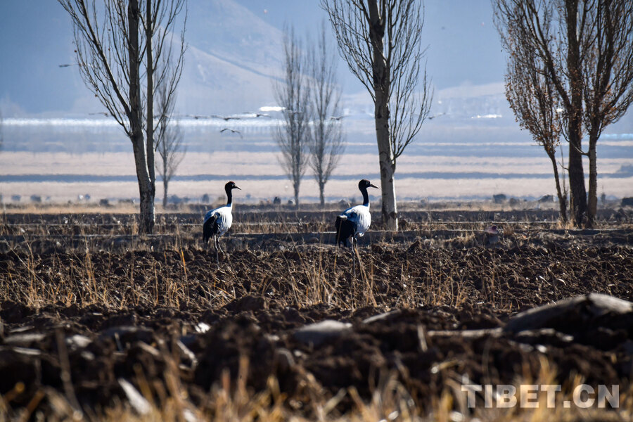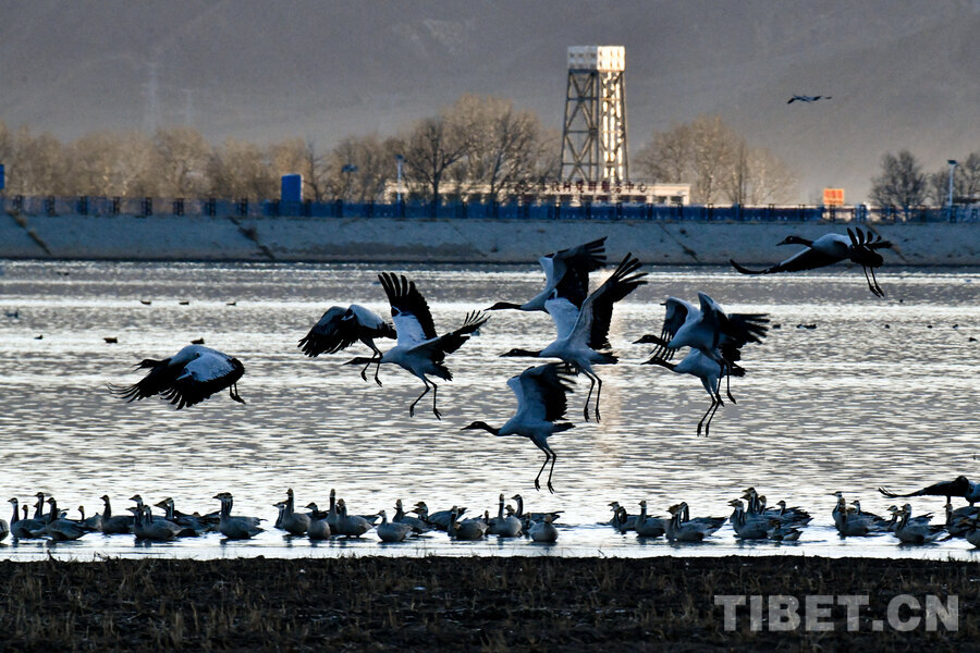 Der Schwarzhalskranich (Grus nigricollis), eine unter nationalem Erstklasse-Schutz stehende Vogelart, erreicht eine Körperlänge von 110-120 Zentimetern und ist die einzige der weltweit 15 existierenden Kranicharten, die ausschließlich in Hochlagen von 2500-5000 Metern lebt. Dieses seltene Tier wird oft als „Hochland-Elfe“ oder „Vogel-Panda“ bezeichnet. Jeweils ab Mitte bis Ende Oktober treffen die Schwarzhalskraniche allmählich in ihren Überwinterungsgebieten ein, darunter das Tal des Mittellaufs des Yarlung-Tsangpo-Flusses. Am 23. November filmte ein Reporter im Kreis Lhünzhub der Stadt Lhasa in Xizang große Gruppen von überwinternden Schwarzhalskranichen.