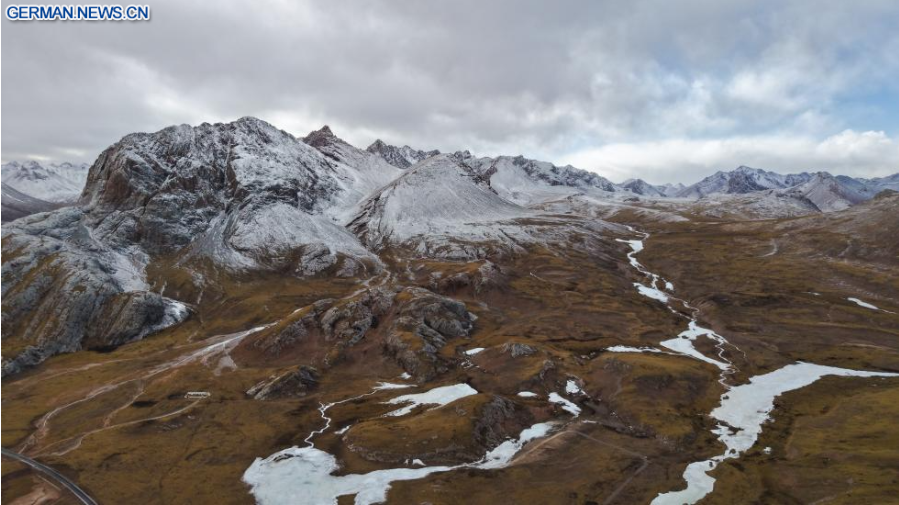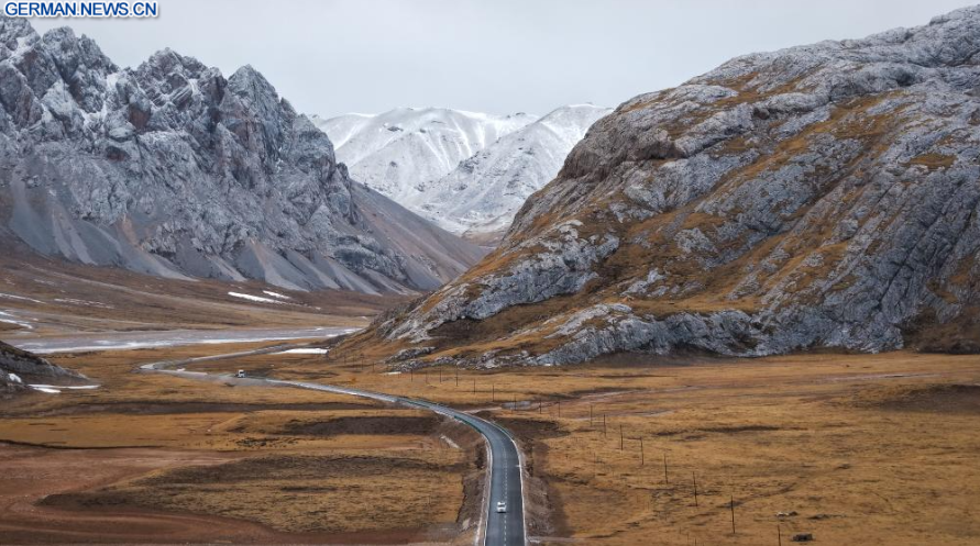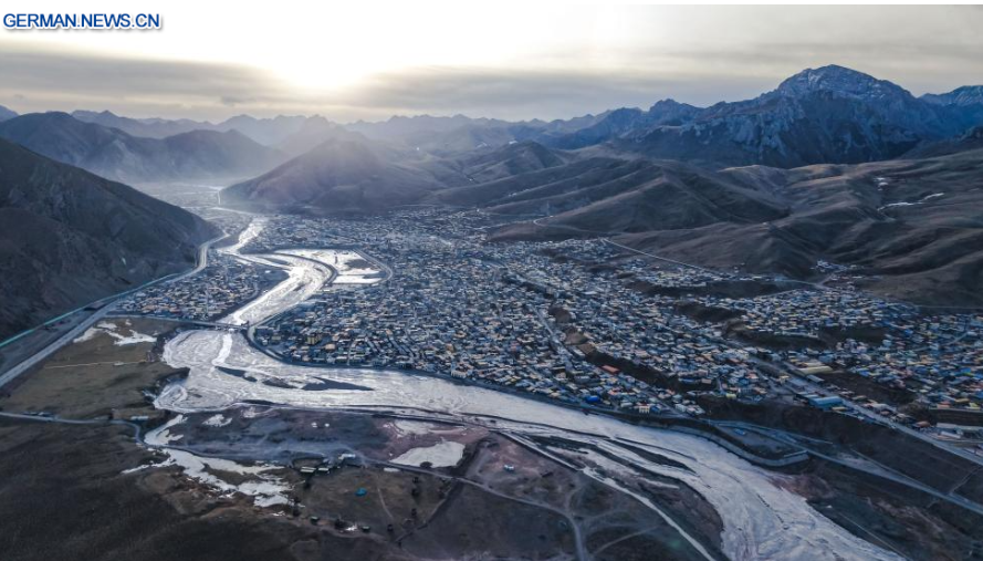 Das am 30. Januar 2026 aufgenommene Luftbild einer Drohne zeigt die Winterlandschaft im Kreis Zadoi der Tibetischen Autonomen Präfektur Yushu in der nordwestchinesischen Provinz Qinghai.