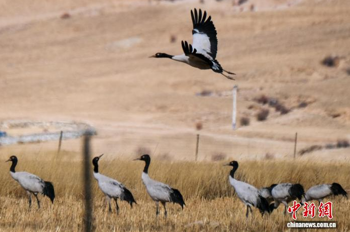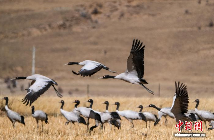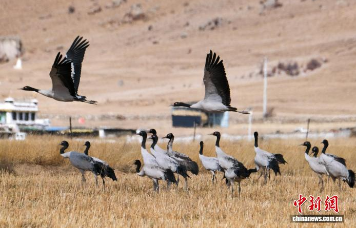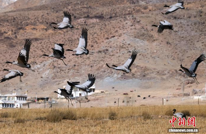 Der Schwarzhalskranich ist ein unter nationalem Schutz der ersten Klasse stehendes Tier in China und die einzige Kranichart, die auf dem Hochplateau lebt und brütet. Er wird von der tibetischen Bevölkerung als „Vogel des Glücks“ verehrt. Der Kreis Lhünzhub in Lhasa, ein wichtiges Überwinterungsgebiet für Schwarzhalskraniche, beherbergt in diesem Jahr zwischen 1800 und 2300 dieser Vögel, wovon etwa die Hälfte im Gebiet des Hutou-Berg-Stausees und des Dorfes Kadong lebt. Viele Schwarzhalskraniche suchen auf den Feldern nach Nahrung und fliegen immer wieder über die Hochlandfelder und Dörfer. Ihre tanzenden Schatten und ihre durchdringenden Rufe verleihen dem Hochland in der Winter- und Frühlingszeit eine besondere Lebendigkeit.