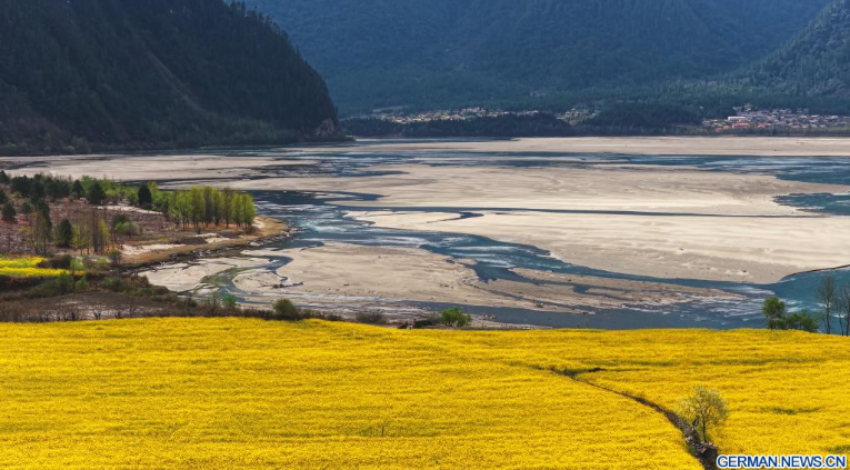 Die Luftaufnahme einer Drohne vom 20. März 2026 zeigt die Pfirsichblüten und ein Feld voller Rapsblüten im Kreis Bomi der Stadt Nyingchi im südwestchinesischen Autonomen Gebiet Xizang. Die Raps- und Pfirsichblüten stehen hier in voller Blüte und schaffen eine malerische Szenerie auf dem Plateau.