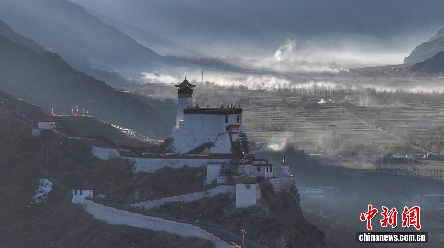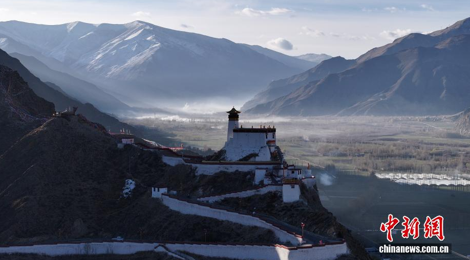 In den frühen Morgenstunden wurde die Yumbu Lagang in der Stadt Lhoka von Xizang vom Sonnenaufgang begrüßt. Das goldene Morgenlicht ergoss sich über den ersten Palast Xizangs, das alte Bauwerk und die Bergkette spiegelten sich malerisch wider, erhaben und still, und zeigten die einzigartige Landschaft von Lhoka, der Quelle der tibetischen Kultur.