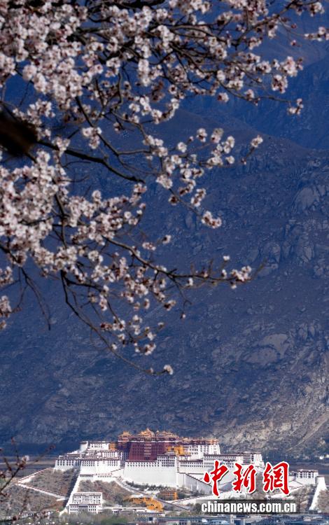Die blühenden Pfirsichbäume im Dorf Tshechogling in Lhasa in Xizang bilden einen harmonischen Kontrast zum Potala-Palast. Die alten Pfirsichbäume im Dorf Tshechogling am Südufer des Lhasa-Flusses in Xizang stehen in voller Blüte und schaffen zusammen mit dem Potala-Palast ein malerisches Frühlingsbild.