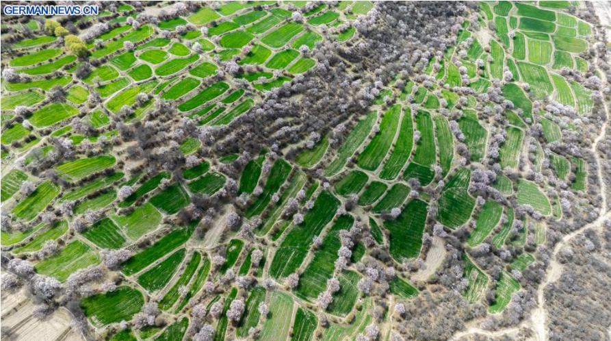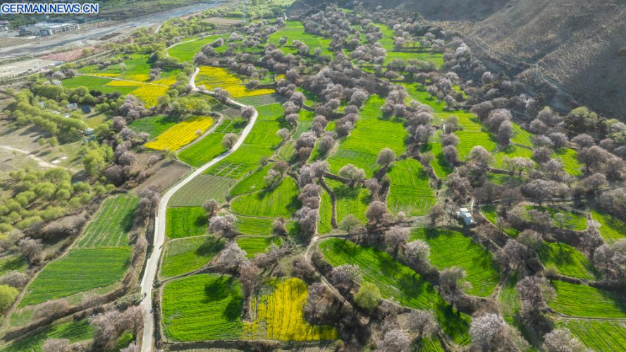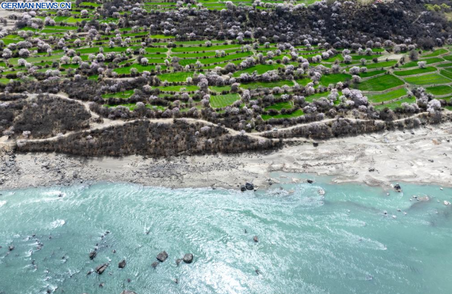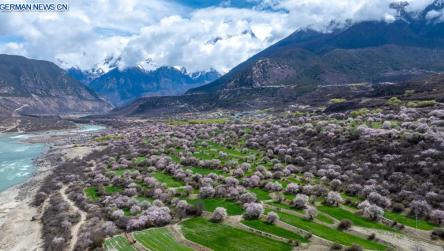 Die Luftaufnahme einer Drohne vom 3. April 2026 zeigt eine Ansicht von Pfirsichblüten in Nyingchi im Autonomen Gebiet Xizang im Südwesten Chinas. Mit steigenden Temperaturen stehen die Pfirsichbäume in Nyingchi in voller Blüte und ziehen zahlreiche Touristen an.