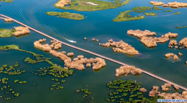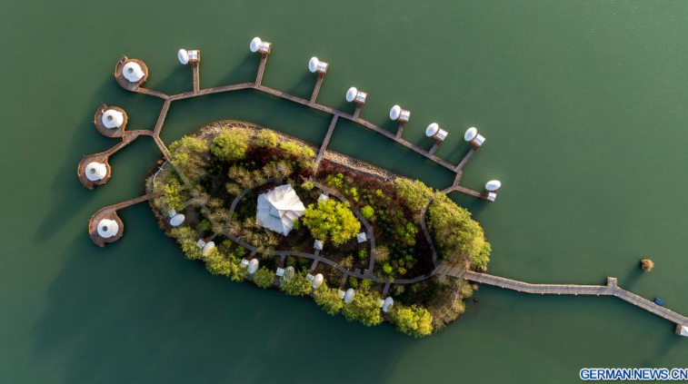 Die Luftaufnahme einer Drohne vom 18. April 2026 zeigt einen Blick auf das Landschaftsgebiet Shahu in Shizuishan im Autonomen Gebiet Ningxia der Hui im Nordwesten Chinas.