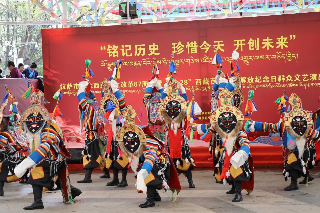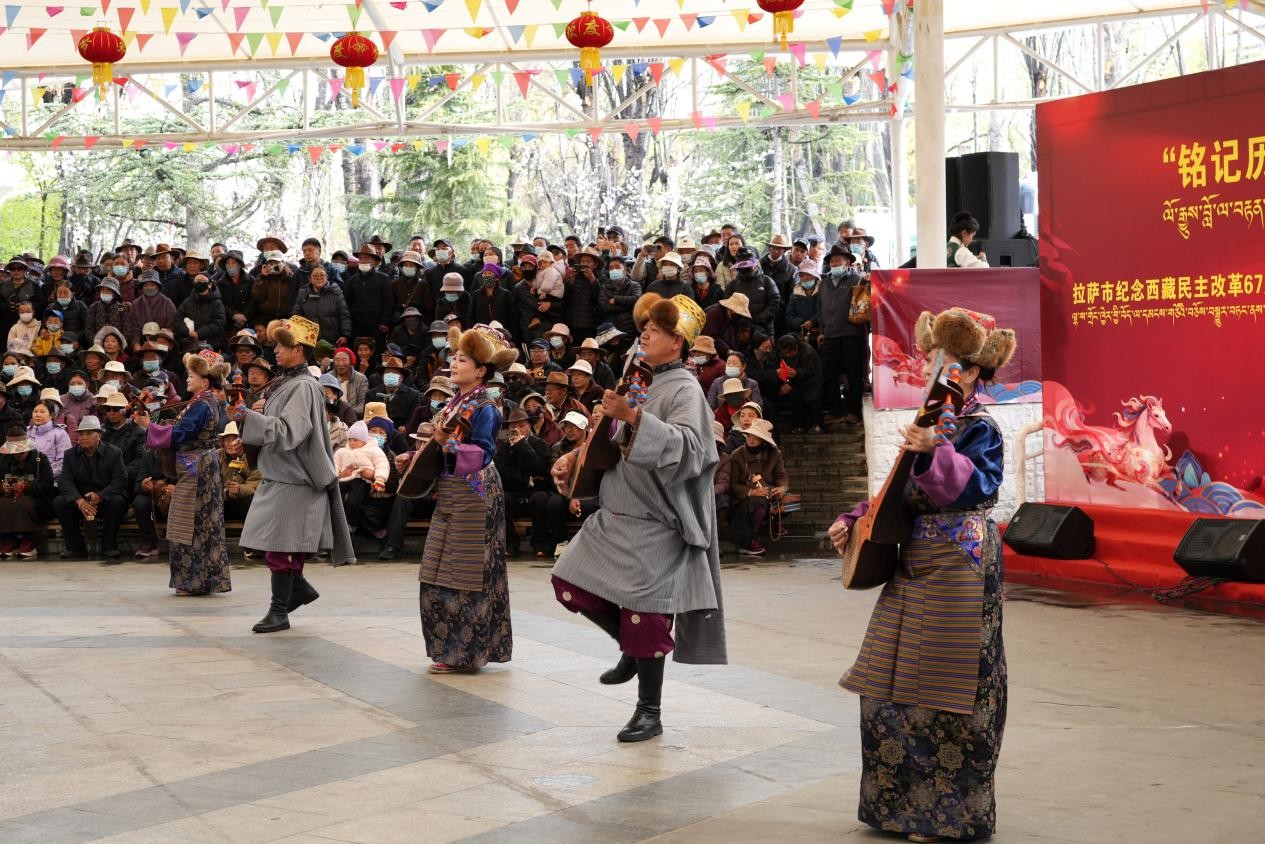 A themed public cultural performance was held in Lhasa on March 28 to mark the 67th anniversary of democratic reform in Xizang. Centered on the theme “Remember History, Cherish the Present, and Create the Future”, the event brought together people from all ethnic groups and sectors, who expressed their shared sentiments through songs and dances, revisiting the past and celebrating the achievements of the New Era. The performance showcased a rich variety of traditional Tibetan art forms, blending music, dance and theatrical elements.