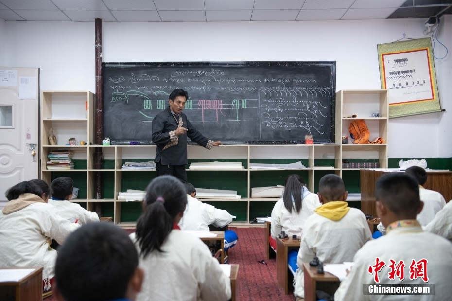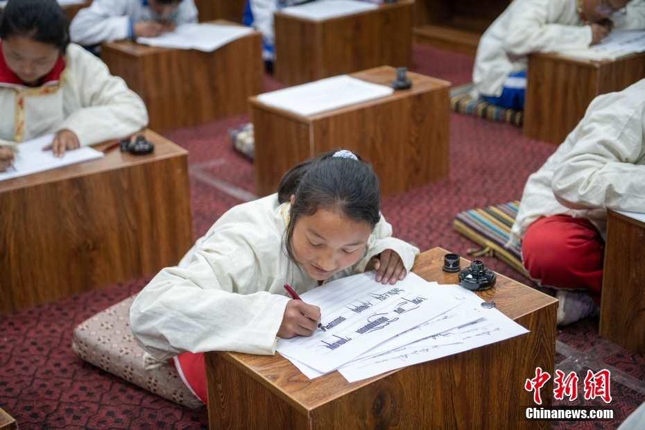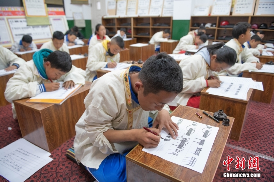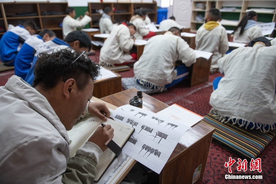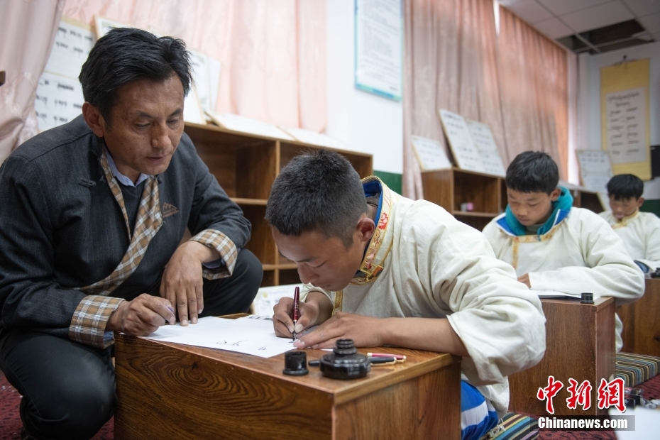 On May 7, Tashi Dawa teaches students the Tibetan calligraphy in the Gyacha County Middle School in Lhoka City, Tibet Autonomous Region. The class, with two teachers teaching Tibetan language, has two lessons per week. The course includes basic writing skills such as writing and posture, as well as writing methods of various types of Tibetan characters such as Ujin style, Zhuca style, Curen style and Cutong style.