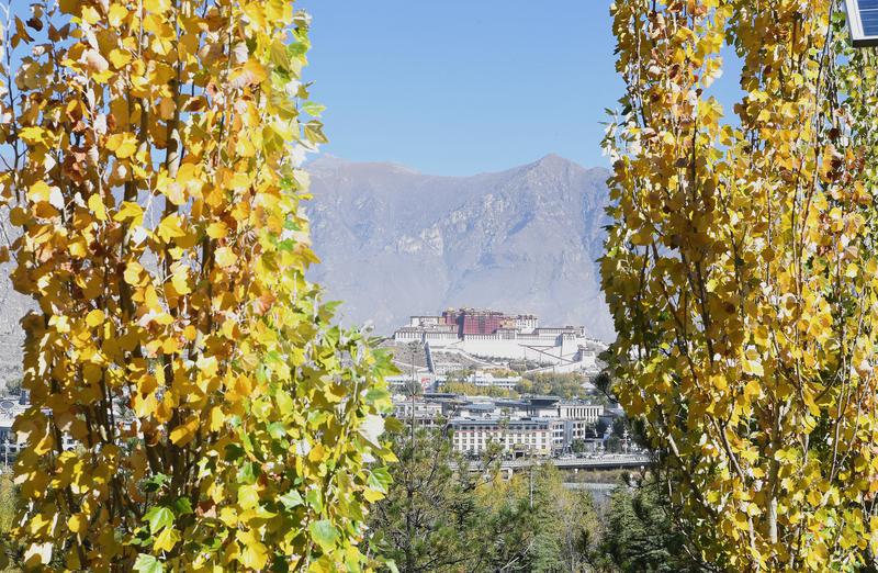 Under the gentle autumn sunlight, the Potala Palace in Lhasa stands resplendent, its white walls and golden roofs shimmering against a backdrop of amber leaves.