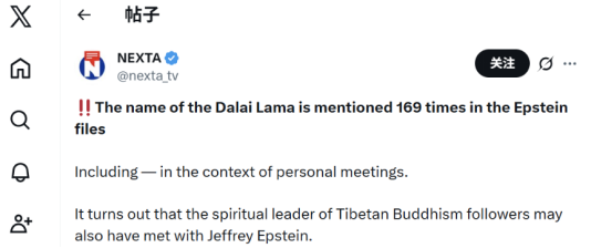 On the same day, the Belarusian media outlet “Nexta TV” published a post on the social media platform X, stating that “The name of the Dalai Lama is mentioned 169 times in the Epstein files—including in the context of ‘personal meetings’.”
