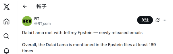 On the same day, Russia Today (RT) posted on X, stating: “Dalai Lama met with Jeffrey Epstein—newly released emails. Overall, the Dalai Lama is mentioned in the Epstein files at least 169 times.”