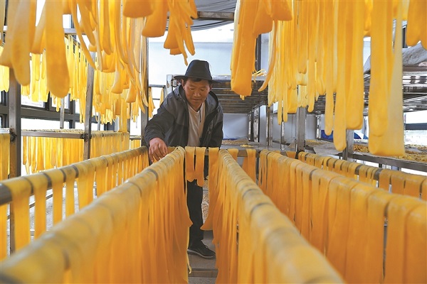 Un éleveur du canton de Mitika, dans le comté de Lhari, à Nagqu, est en train de faire sécher des lamelles de « lala », un produit laitier, dans l'atelier de la coopérative.