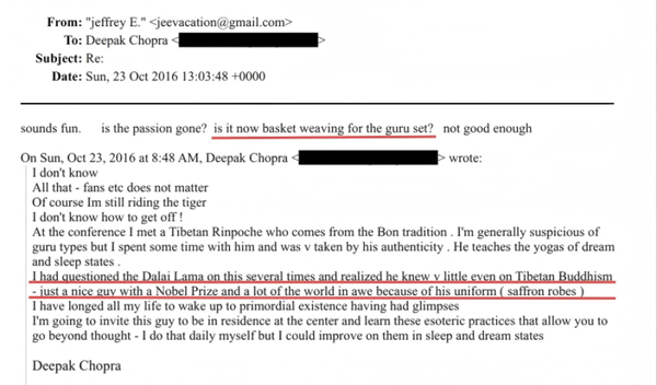 Le 23 octobre 2016, le médecin et écrivain indo-américain Deepak Chopra a écrit à Epstein : « J'ai consulté le Dalai Lama à plusieurs reprises, et j'ai découvert qu'il ne savait pas grand-chose, même sur le bouddhisme tibétain — ce n'est qu'un bon gars (nice guy) ayant reçu un prix Nobel, et si les gens le vénèrent, c'est surtout en raison de son statut (sa robe rouge bordeaux). » Epstein lui a répondu en plaisantant : Est-ce que c'est devenu un passe-temps ennuyeux pour les maîtres (comme tresser des paniers) ?