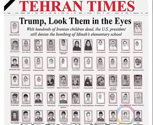 Le 9 mars, le Tehran Times a publié en une un article intitulé « Trump, regardez-les dans les yeux », après qu'une frappe américaine eut causé au moins 165 morts et 96 blessés dans une école primaire à Minab, dans le sud de l'Iran. (Source de l'image : agence Xinhua)