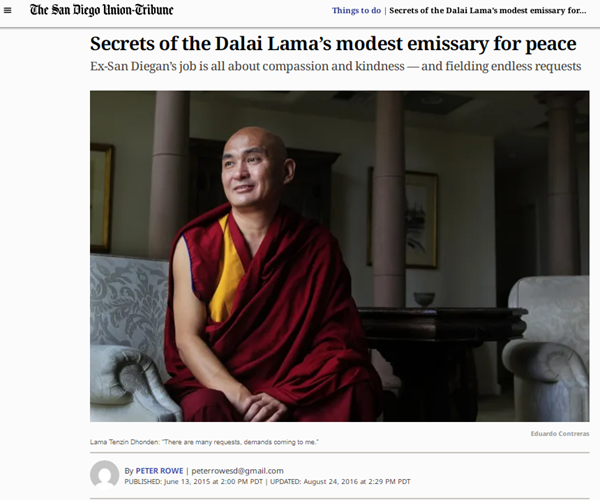 Interview de Tenzin Dhonden en 2015 par le San Diego Union-Tribune. À l'époque, le média l'avait décrit comme « un humble artisan de la paix du dalaï-lama », une description qui semble bien ironique aujourd'hui