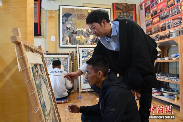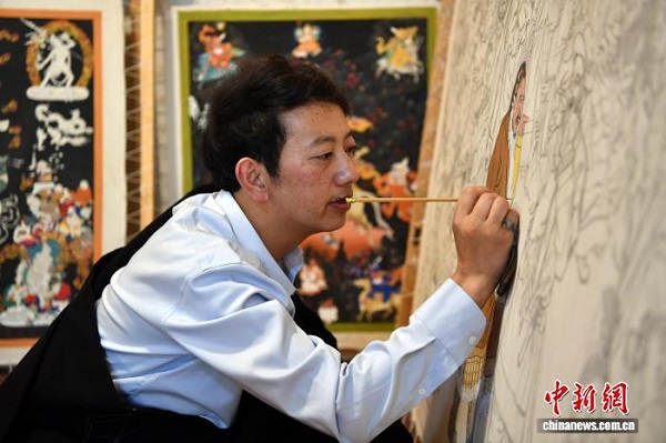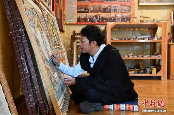 Le peintre de Thangka Zhuozhuo en plein processus créatif d'une œuvre dans son atelier.