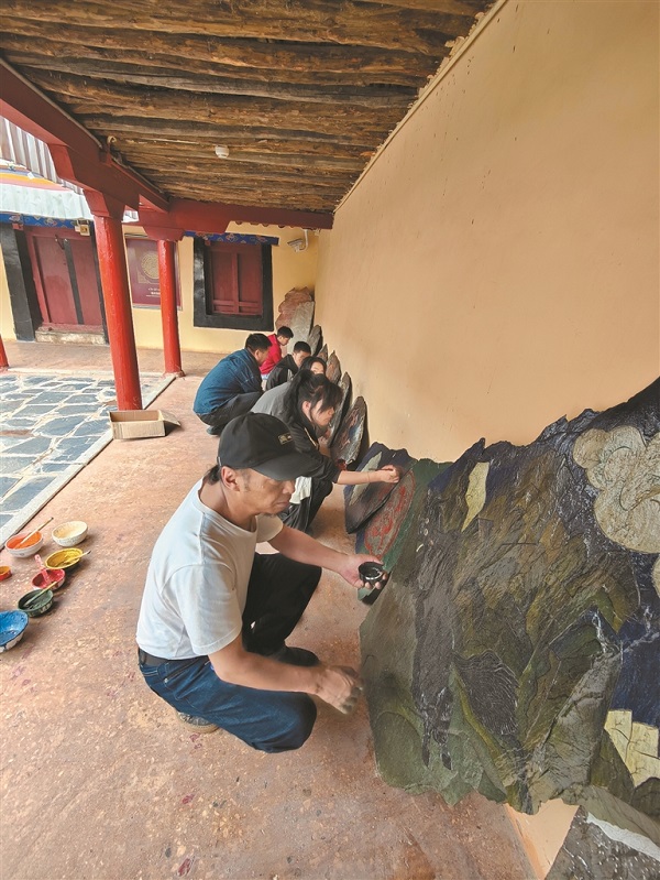 De l'estrade au chevalet, de la salle de classe aux chantiers de restauration des anciens édifices, Gyatso, artiste de premier rang, retrace du bout des doigts le fil millénaire de la peinture décorative tibétaine ; depuis deux décennies, il se consacre sans relâche à l'éducation professionnelle, y semant la culture et perpétuant la flamme de la tradition. Tel un « dougong », ces emboîtements sculptés qui soutiennent silencieusement l'architecture tibétaine, il œuvre dans la discrétion mais porte solidement la transmission de l'art pictural tibétain, la continuité de ce patrimoine culturel, et l'engouement de la jeune génération pour renouer avec les savoir-faire ancestraux.