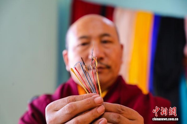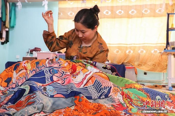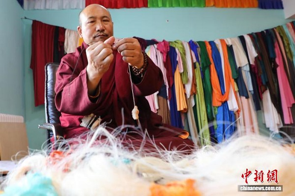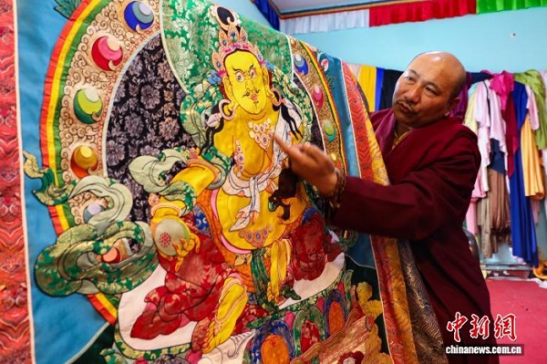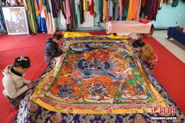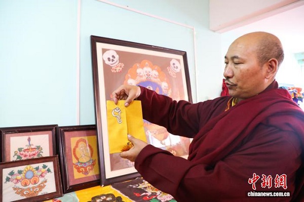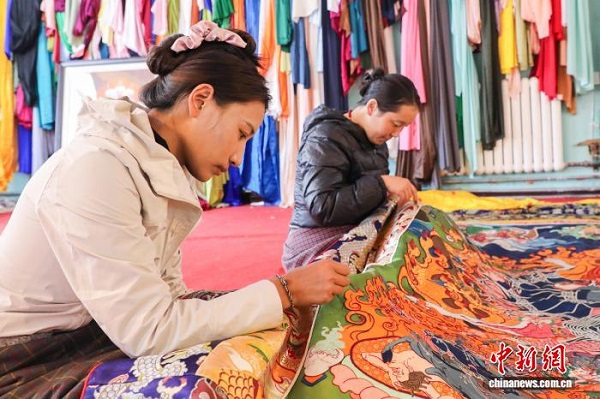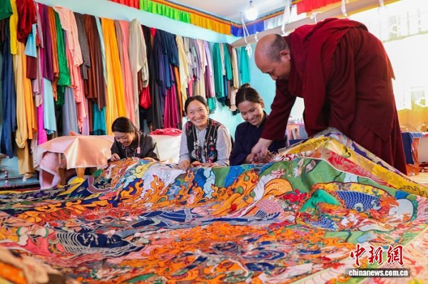 Dans l'atelier de transmission du thangka tibétain du comté de Baima, situé dans la préfecture autonome tibétaine de Golog de la province du Qinghai, le maître artisan Thubten Weise présente les caractéristiques du thangka brodé au fil de crin de cheval, un savoir-faire propre à Baima. Cette technique se distingue par l'utilisation conjointe de crin de cheval et de fil de soie pour tracer les contours, mêlant broderie, appliqué et peinture. Forte de plus de quatre siècles d'histoire, elle aborde des thèmes liés à l'histoire, à la culture et à la vie quotidiennes du peuple tibétain. Les œuvres se caractérisent par un effet en relief et une remarquable durabilité. En 2021, cette tradition a été inscrite sur la cinquième liste du patrimoine culturel immatériel national de Chine. Ces dernières années, le comté de Baima a renforcé la formation aux techniques du patrimoine immatériel, favorisant ainsi la transmission du savoir-faire tout en soutenant l'emploi et l'augmentation des revenus locaux.