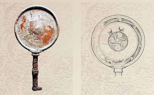 Miroir en bronze à manche, mis au jour dans les tombes à chambres funéraires en pierre de Qoigong, à Lhassa (début de l'âge du métal au Xizang), le revers du miroir est ciselé de motifs de yaks et d'oiseaux appariés. Photo fournie par Li Yongxian.