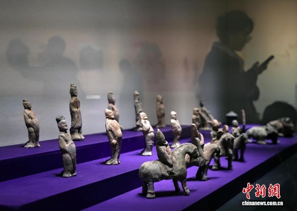 Sur la photo : des visiteurs observent des figurines en terre cuite datant de la période des Wei occidentaux.