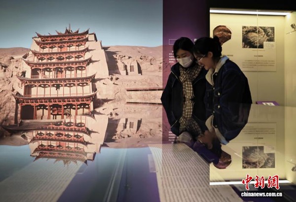 Sur la photo : des visiteurs observent des rouleaux de sutras provenant des grottes de Mogao exposés.