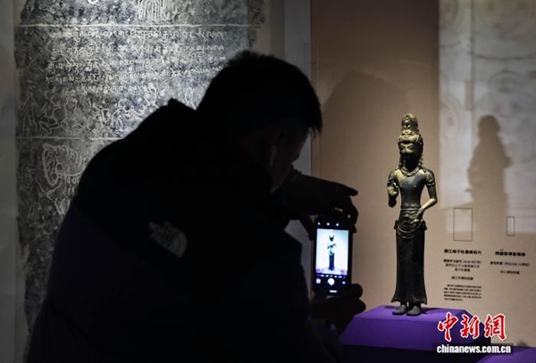 Sur la photo : des visiteurs photographient une statue en bronze de Guanyin datant des dynasties Tang et Song.