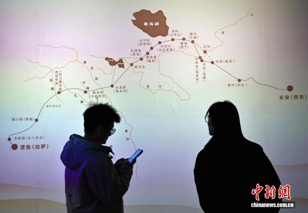 Sur la photo : des visiteurs regardent le schéma illustrant le tracé de l'ancienne route Tang-Tubo.