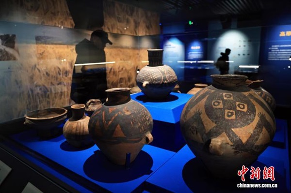 Sur la photo : des visiteurs observent des poteries de la culture de Majiayao datant de l'époque néolithique exposées.