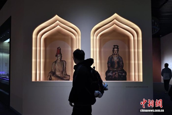 Sur la photo : des visiteurs observent des figurines en terre cuite datant de la période des Wei occidentaux.