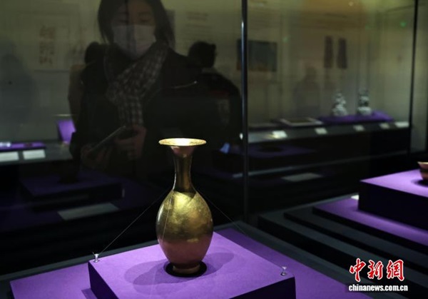 Sur la photo : des visiteurs regardent un vase en or de type Hu datant de la dynastie Tang exposé.