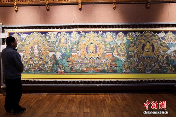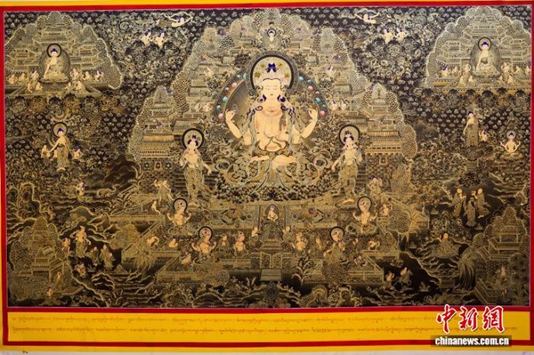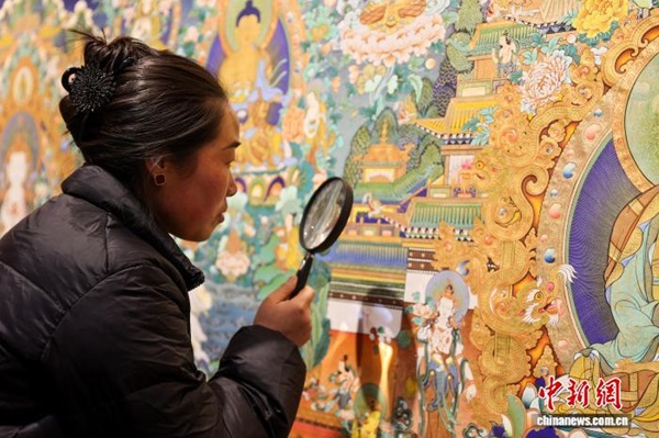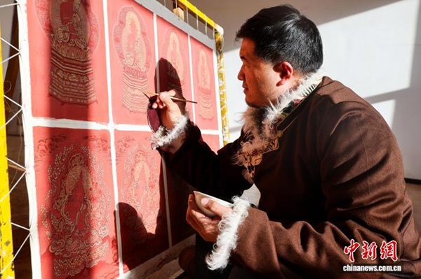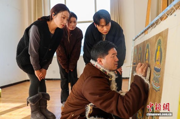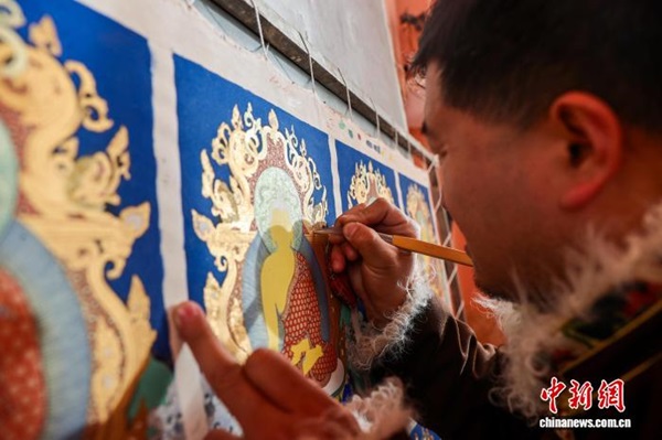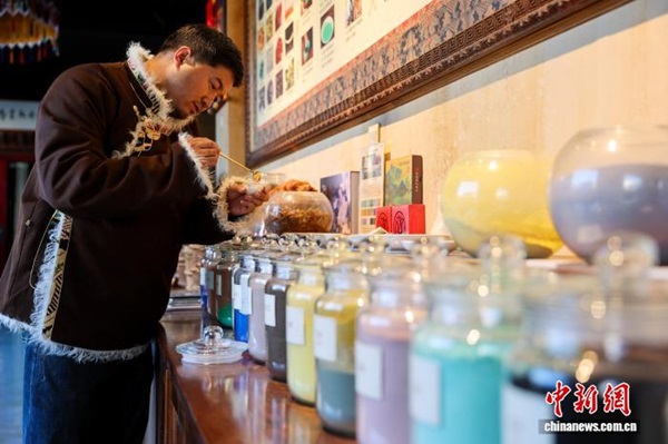 Dans l'atelier de peinture Shengjing de la ville de Tongren, située dans la préfecture autonome tibétaine de Huangnan, dans la province du Qinghai, le peintre de thangka Sharwo Gyatso sélectionne les pigments minéraux nécessaires à la réalisation d'un thangka. Issus de l'écosystème culturel unique de la région, les thangkas de Regong sont salués comme une bannière au charme singulier dans l'art pictural. Aujourd'hui, de nombreux artistes transmettent aux jeunes générations ses techniques fondamentales, telles que la préparation des couleurs, le tracé des lignes et la dorure, grâce à des programmes d'apprentissage structurés et à la mise en place d'ateliers de formation, permettant ainsi à cet art ancestral de se perpétuer et de s'épanouir.
