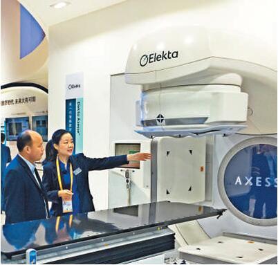 Elekta Axesse, une plate-forme numérique intelligente pour la radiothérapie tumorale de nouvelle génération, est présentée aux exposants. (Huang Chao / Le Quotidien du Peuple)
